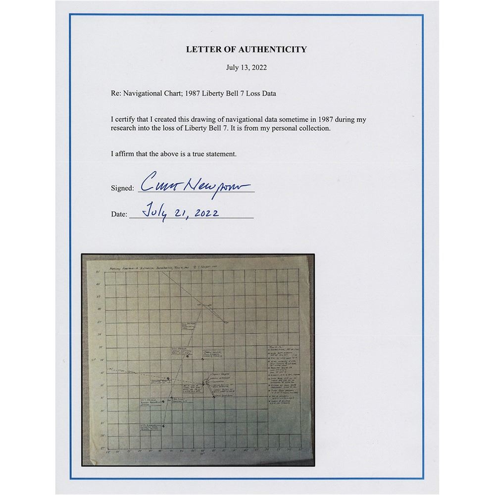 Accompanied by a signed letter of authenticity from Newport, who states: ‰ÛÏI certify that I created this drawing of navigational data sometime in 1987 during my research into the loss of Liberty Bell 7. It is from my personal collection.‰Û