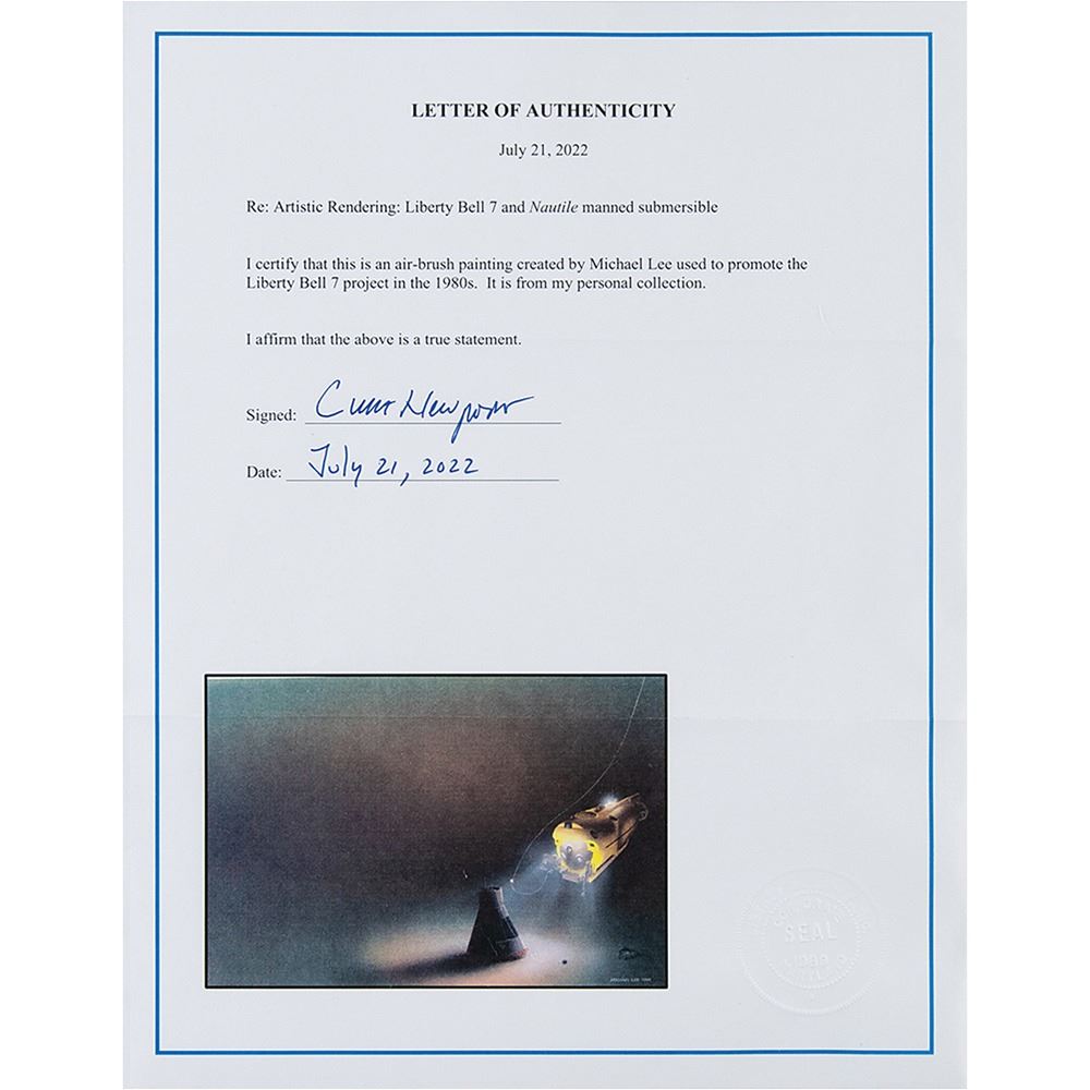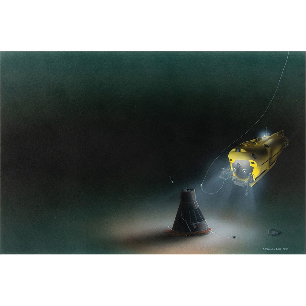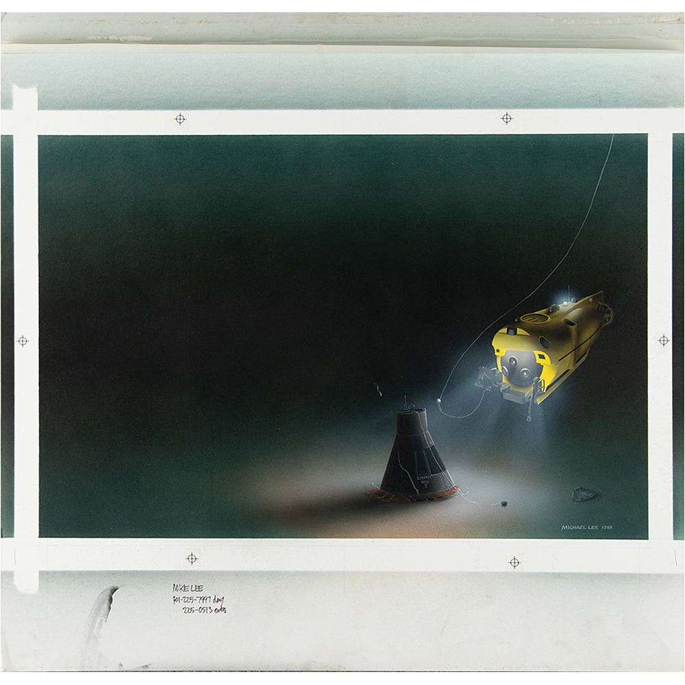 Original airbrushed painting by artist Michael Lee of the sunken Liberty Bell 7 spacecraft on the floor of the Atlantic Ocean, accomplished on 20.75 x 20 illustration board and depicting Gus Grissom‰Ûªs Mercury-Redstone 4 capsule‰ÛÓwith its hastily jettisoned escape hatch nearby‰ÛÓilluminated by a Nautile-like submersible carrying a recovery line. Signed in gray paint in the lower right, ‰ÛÏMichael Lee 1988,‰Û and the lower border featuring Lee‰Ûªs contact information. In fine condition, with a tiny scuff near the upper-left of the capsule. Accompanied by a signed letter of authenticity from Curt Newport, the team leader of the Liberty Bell 7 Recovery Expedition, who states: ‰ÛÏI certify that this is an air-brush painting created by Michael Lee used to promote the Liberty Bell 7 project in the 1980s. It is from my personal collection.‰Û