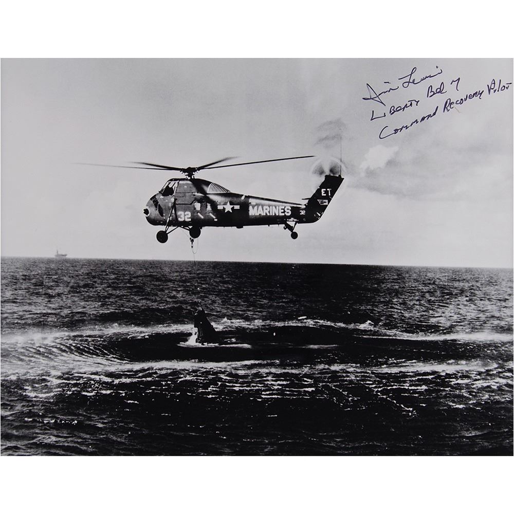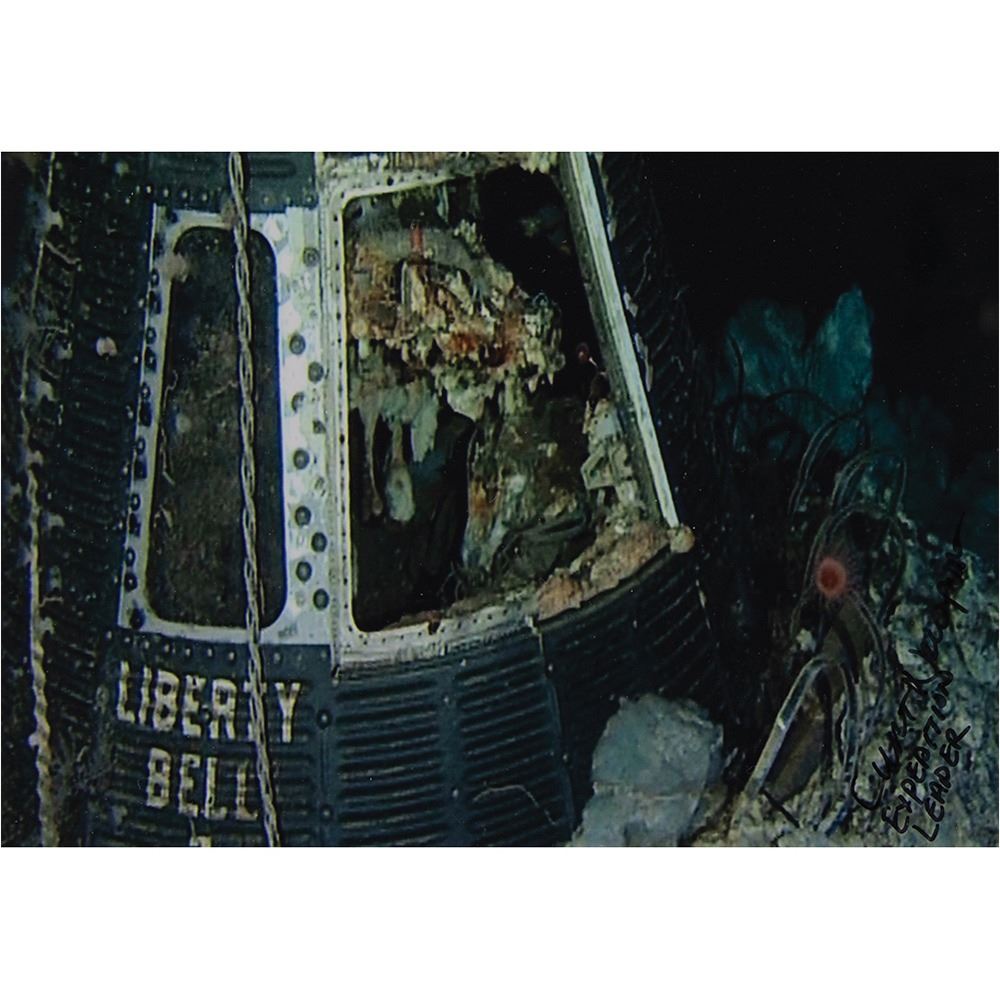 The cables are mounted together and displayed with an embroidered ‰ÛÏLiberty Bell Seven Project Team‰Û patch and glossy photos of the capsule‰ÛÓduring the first recovery attempt and at the bottom of Blake‰Ûªs Basin‰ÛÓthat are signed individually in black felt tip, ‰ÛÏJim Lewis, Liberty Bell 7, Command Recovery Pilot‰Û and ‰ÛÏCurt Newport, Expedition Leader.‰Û Matted and framed together to an overall size of 18 x 25; the frame backing has been numbered, signed, and dated in pencil by Newport, ‰ÛÏ001, C. Newport, 5 July 2022.‰Û