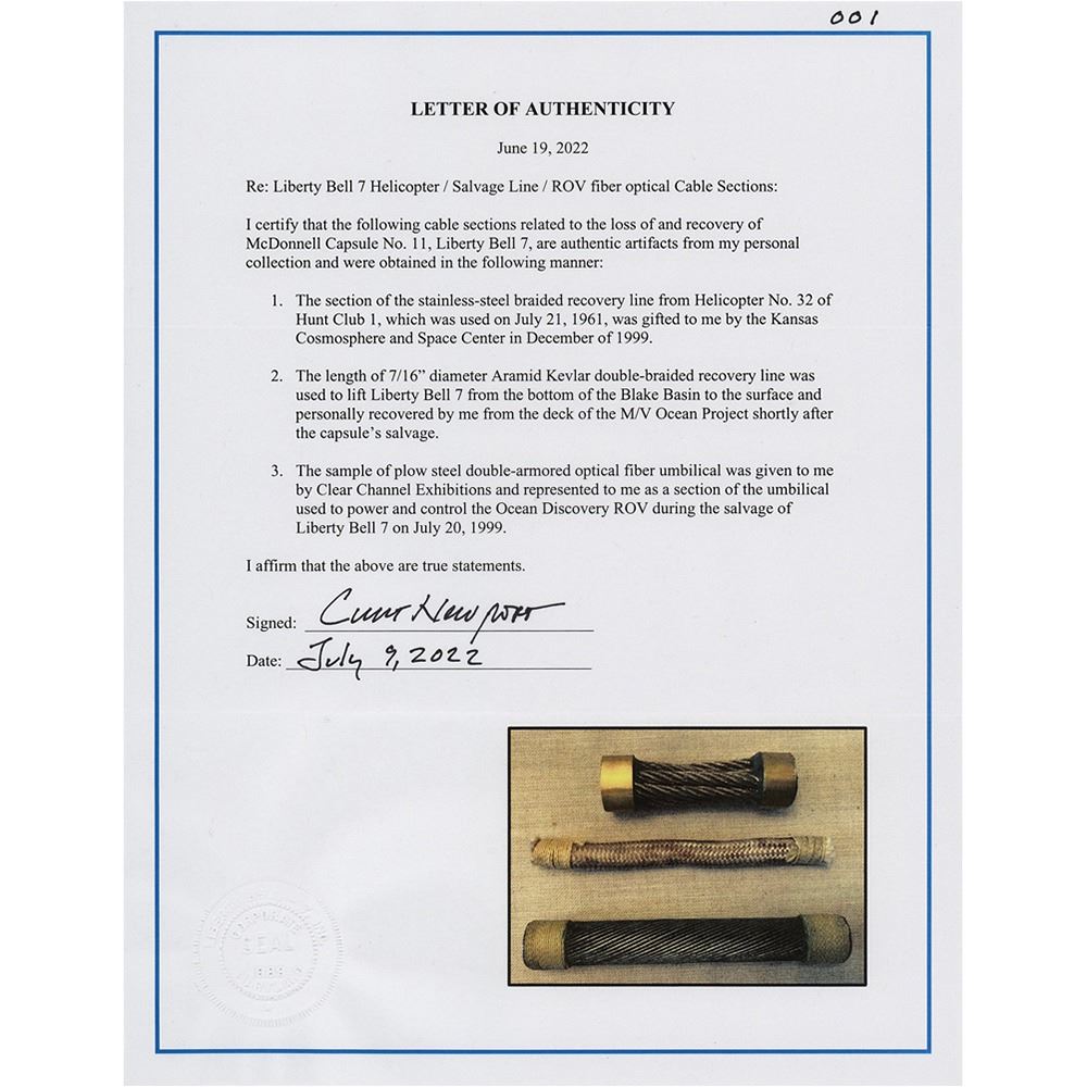 Accompanied by a signed letter of authenticity from Newport, who states that ‰ÛÏthe following cable sections related to the loss of and recovery of McDonnell Capsule No. 11, Liberty Bell 7, are authentic artifacts from my personal collection."