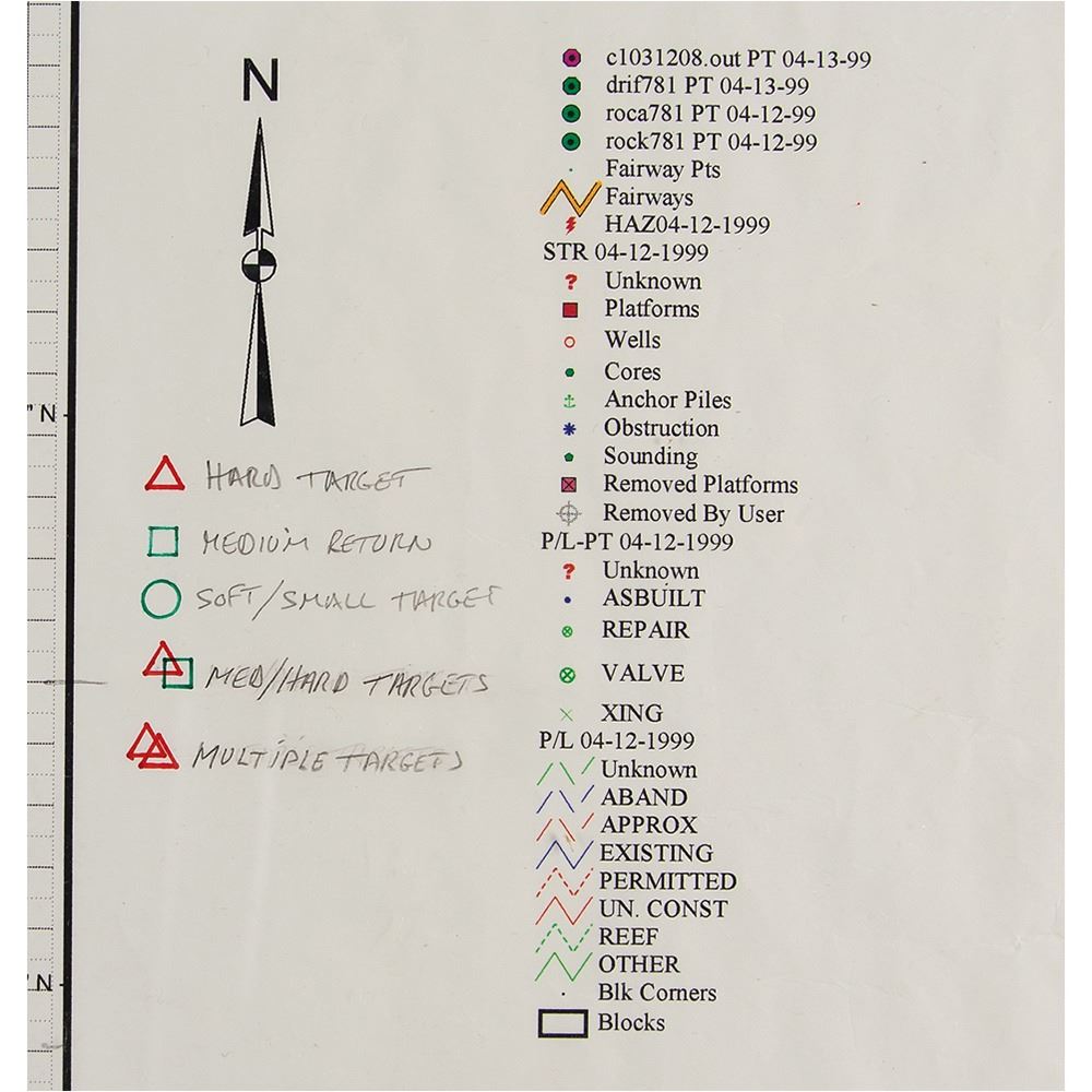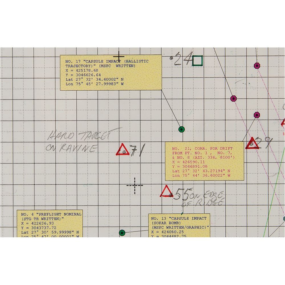 The chart contains several layers of navigational data for 1961 pre-flight, 1961 post-flight, and the 1999 side-scan sonar targets. The boxes identifying the locations indicate from which NASA STG document the information derives, whether the data was numerical or graphical in nature, and the corresponding publication date. The critical characteristics of this chart are the color-coding and the shape of the symbols representing the 88 sonar targets identified by the Ocean Explorer 6000 sonar. Fifteen of these targets were deemed worthy of further investigation and grouped into three areas, each representing a dive evolution. The symbols and colors represent three categories of sonar contacts: singular hard target (red triangle), green square (multiple grouped contacts), and brown circle (soft targets). The filtering of the targets using this technique allowed the team to make operational decisions by comparing the sonar data against the estimated 1961 locations. Newport placed considerable weight on the FPS-16 radar location generated from the Grand Bahama Island tracking station because it was raw radar data and because he believed in the accuracy of this radar in the automatic beacon mode. Newport knew this because, before the search mission, he tracked down and interviewed the engineer who calibrated the radar before Grissom‰Ûªs flight. Rolled and in very good to fine condition, with a missing lower right corner, and some small tears, creases, and tape remnants to edges.