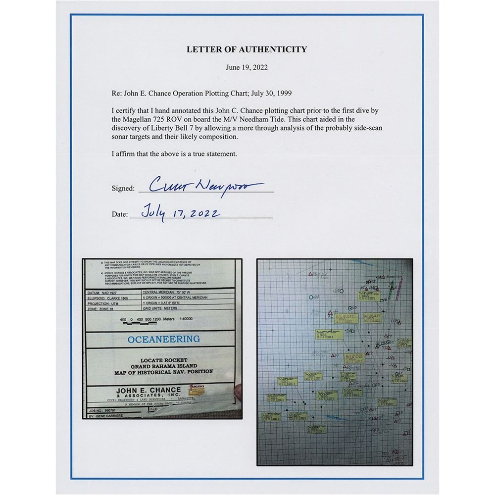 Accompanied by a signed letter of authenticity from Newport, who states: ‰ÛÏI certify that I hand annotated this John E. Chance plotting chart prior to the first dive by the Magellan 725 ROV on board the M/V Needham Tide. This chart aided in the discovery of the Liberty Bell 7 by allowing a more thorough analysis of the probably side-scan sonar targets and their likely comparison.‰Û