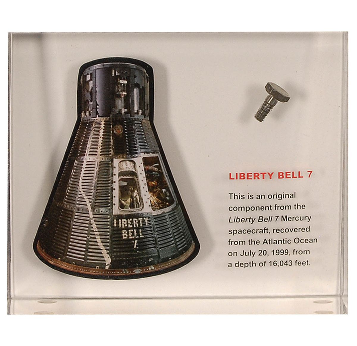 Flown screw from Gus Grissom’s Liberty Bell 7, recovered from the Atlantic Ocean on July 20, 1999. Screw measures approximately .5? in length and is presented inside a Lucite display with an image of the spacecraft, as well as printed information about the recovery.