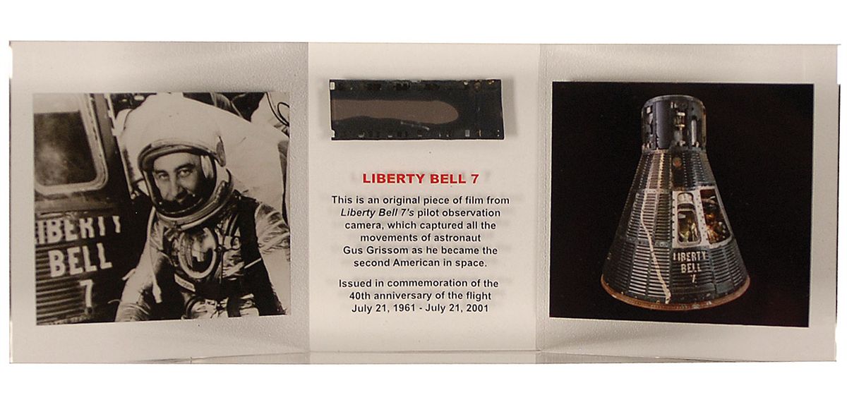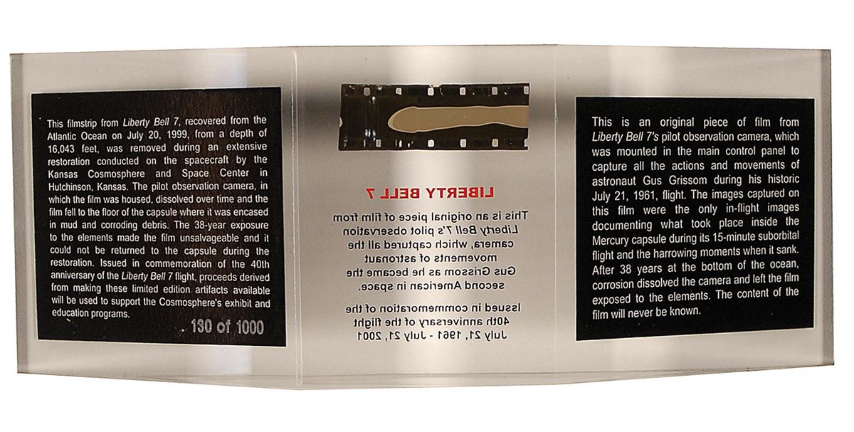 A limited edition presentation containing a 1.5? long segment of film from Liberty Bell 7’s pilot observation camera, recovered from the Atlantic Ocean on July 20, 1999, from a depth of 16,043 feet. Strip is housed in a triangular acrylic, #130/1000, with an image of the space craft, and Gus Grissom, and two explanatory plaques on the reverse, stating that the film contained the only in-flight images of Grissom during his flight and the harrowing moments after splashdown, and was issued in commemoration of the 40th anniversary of Grissom’s flight by the Kansas Cosmosphere. In fine condition. Accompanied by its original box and certificate of authenticity from the Kansas Cosmosphere.