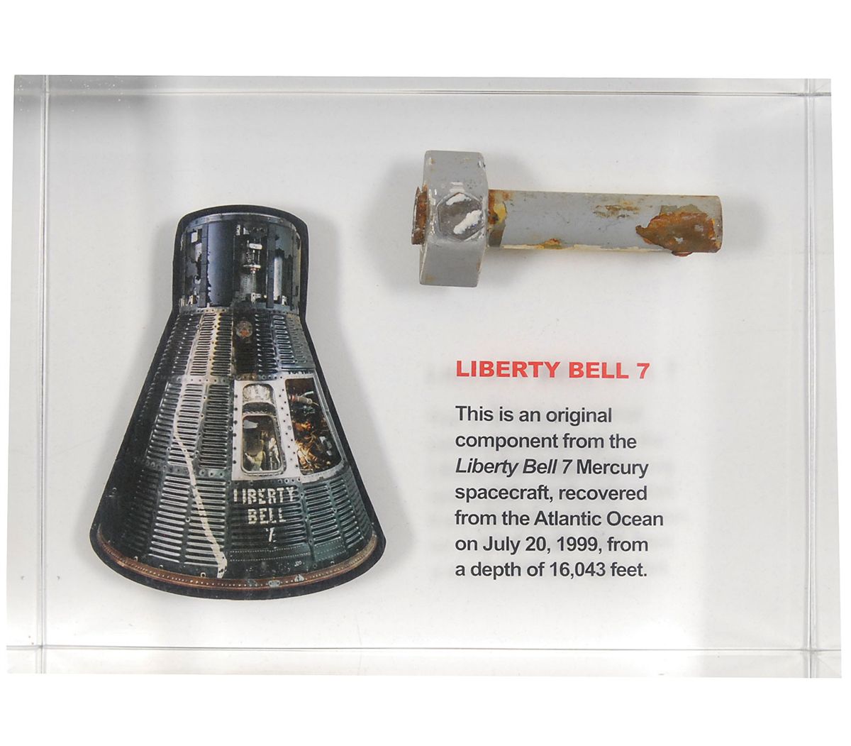 Flown bolt from Gus Grissom’s Liberty Bell 7, recovered from the Atlantic Ocean on July 20, 1999. Slightly corroded bolt measures approximately 2.5? in length and is presented along with an image of the spacecraft, as well as printed information about the recovery inside an acrylic display which measures 7 x 5 x 2.75. Accompanied by its original box and certificate of authenticity from the Kansas Cosmosphere, which restored the capsule after its recovery.
