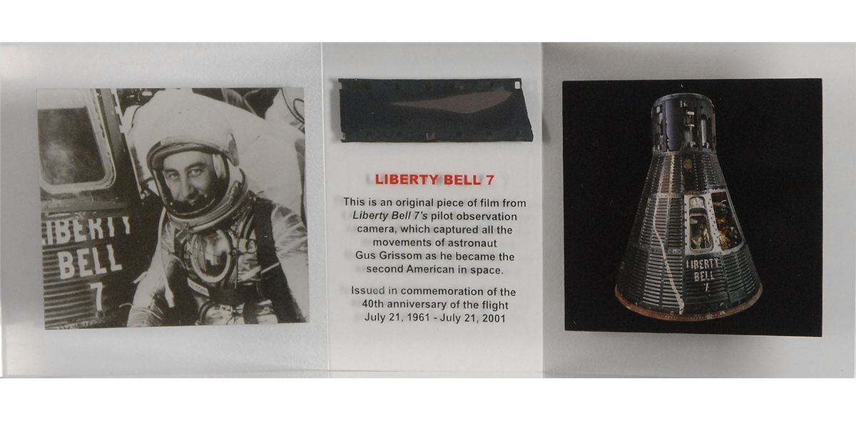 A limited edition presentation containing a 1.5? long segment of film from Liberty Bell 7’s pilot observation camera, recovered from the Atlantic Ocean on July 20, 1999, from a depth of 16,043 feet. Strip is housed in a triangular acrylic display, numbered 242/1000, with an image of the space craft and Gus Grissom, and two explanatory plaques on the reverse, stating that the film contained the only in-flight images of Grissom and the harrowing moments after splashdown, and was issued in commemoration of the 40th anniversary of Grissom’s flight by the Kansas Cosmosphere.