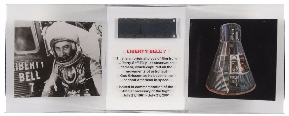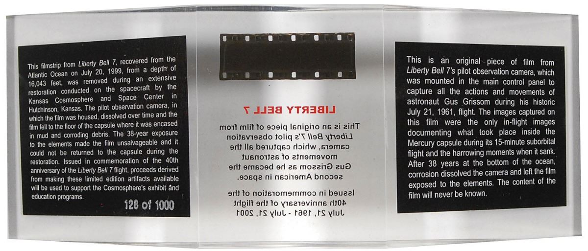 A limited edition presentation containing a 1.5? long segment of film from Liberty Bell 7’s pilot observation camera, recovered from the Atlantic Ocean on July 20, 1999, from a depth of 16,043 feet. Strip is housed in a triangular acrylic, #128/1000, with an image of the space craft, and Gus Grissom, and two explanatory plaques on the reverse, stating that the film contained the only images of Grissom during his flight and the harrowing moments after splashdown, and was issued in commemoration of the 40th anniversary of Grissom’s flight by the Kansas Cosmosphere. In fine condition. Accompanied by its original box and certificate of authenticity from the Kansas Cosmosphere.