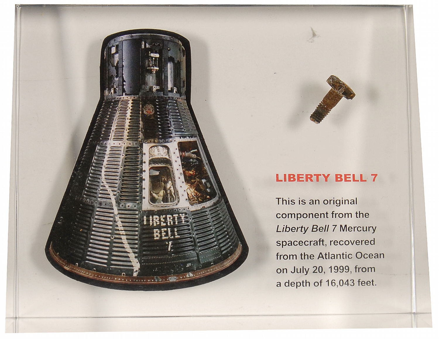 Flight-flown bolt from Gus Grissom’s Liberty Bell 7, recovered from the Atlantic Ocean on July 20, 1999. Corroded bolt measures approximately .5? in length and is presented inside a Lucite display with an image of the spacecraft, as well as printed information about the recovery. Accompanied by a certificate of authenticity from the Kansas Cosmosphere and Space Center, which restored the capsule after its recovery.