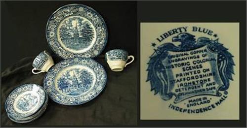Liberty Blue Independence Hall Colonial scenes, two dinner plates 10" across and six Old North Church saucers no chips or cracks and two cups with Paul Revere marked England
