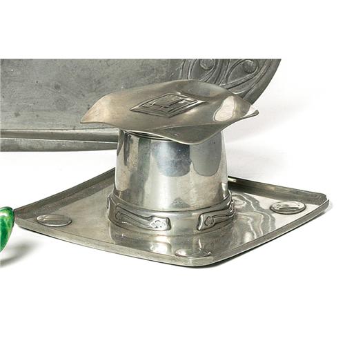 Liberty & Co. inkwell, hammered pewter, designed by Archibald Knox, unusual design with attached tray, marked English Pewter made by Liberty & Co. 0401, 6"w x 3"h