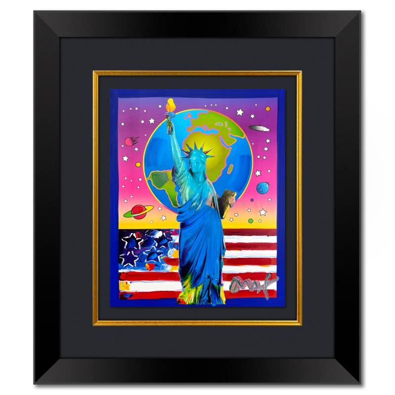 "Liberty, Earth and Flag" is a one-of-a-kind mixed media on paper, hand signed by Peter Max. The piece comes custom framed with a backside cutout to display Peter Max Studio registration number 208278 certifying authenticity. Measures approximately 28" x 24" (frame), 19" x 15" (image).