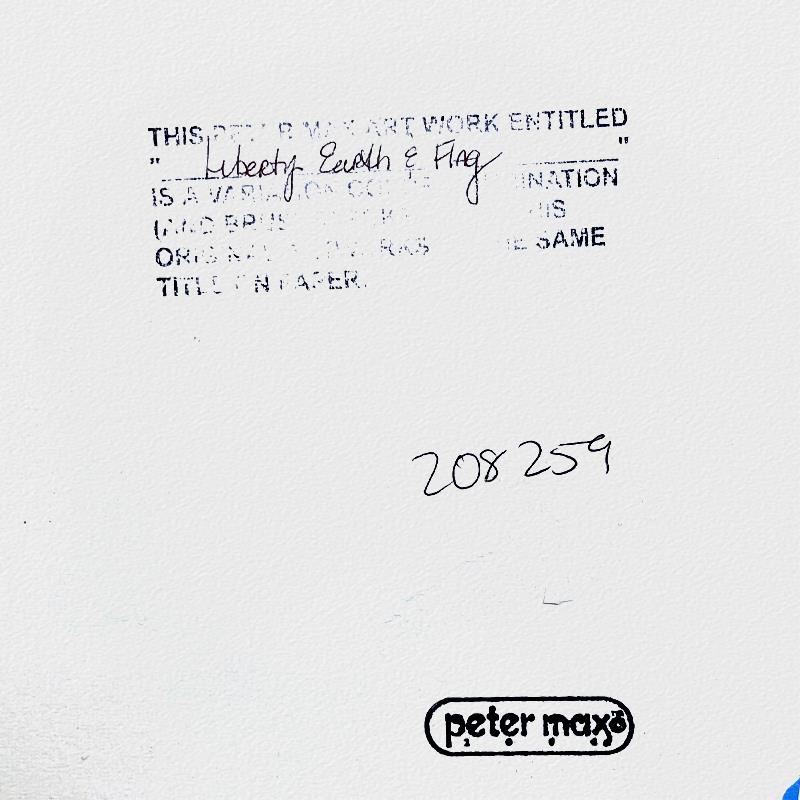 "Liberty, Earth and Flag" is a one-of-a-kind mixed media on paper, hand signed by Peter Max. The piece comes custom framed with a backside cutout to display Peter Max Studio registration number 208254 certifying authenticity. Measures approximately 28" x 24" (frame), 19" x 15" (image). This item requires special handling and may have a longer than usual turnaround.