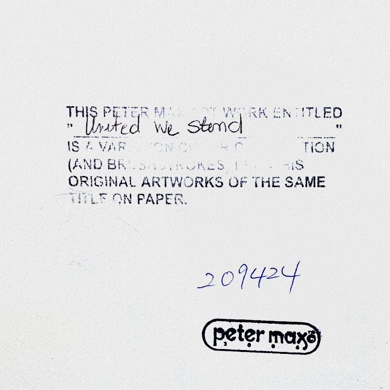 "Liberty, Earth and Flag" is a one-of-a-kind mixed media on paper, hand signed by Peter Max. The piece comes custom framed with a backside cutout to display Peter Max Studio registration number 209424 certifying authenticity. Measures approximately 28" x 24" (frame), 19" x 15" (image). This item requires special handling and may have a longer than usual turnaround.