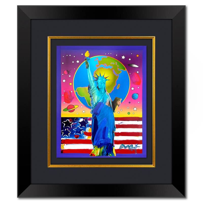 "Liberty, Earth and Flag" is a one-of-a-kind mixed media on paper, hand signed by Peter Max. The piece comes custom framed with a backside cutout to display Peter Max Studio registration number 252514 certifying authenticity. Measures approximately 28" x 24" (frame), 19" x 15" (image). This item requires special handling and may have a longer than usual turnaround.