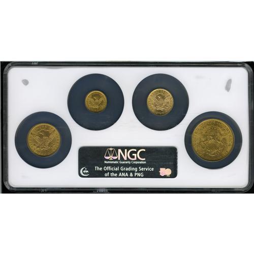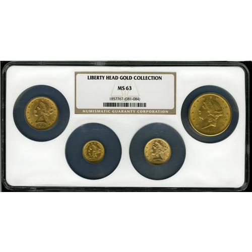 <B>"Liberty Head Gold Collection" MS63 NGC,</B></I> four representatives encased in a single custom NGC holder. The set includes: <B>1907 quarter eagle MS63,</B></I> frosty with strong detail overall; <B>1900 half eagle MS63,</B></I> sharply struck and largely straw-gold with a ruby copper spot below the eagle's right (facing) wing; <B>1901 eagle MS63,</B></I> a lightly abraded orange-gold piece with typical detail and a copper spot on the lower bust; and a <B>1904 double eagle MS63,</B></I> a luminous yellow-orange example with scattered marks.<BR><BR><b>Shipping:</b> Coins & Currency (<a target="_blank" href="http://www.heritageauctions.com/common/shipping.php">view shipping information</a>)