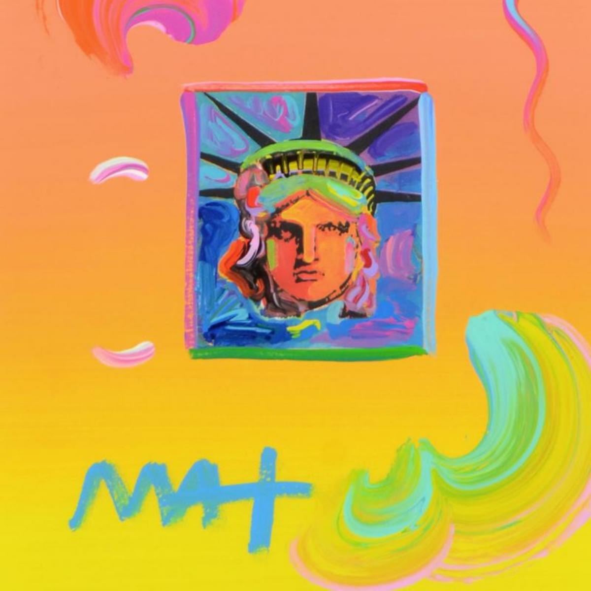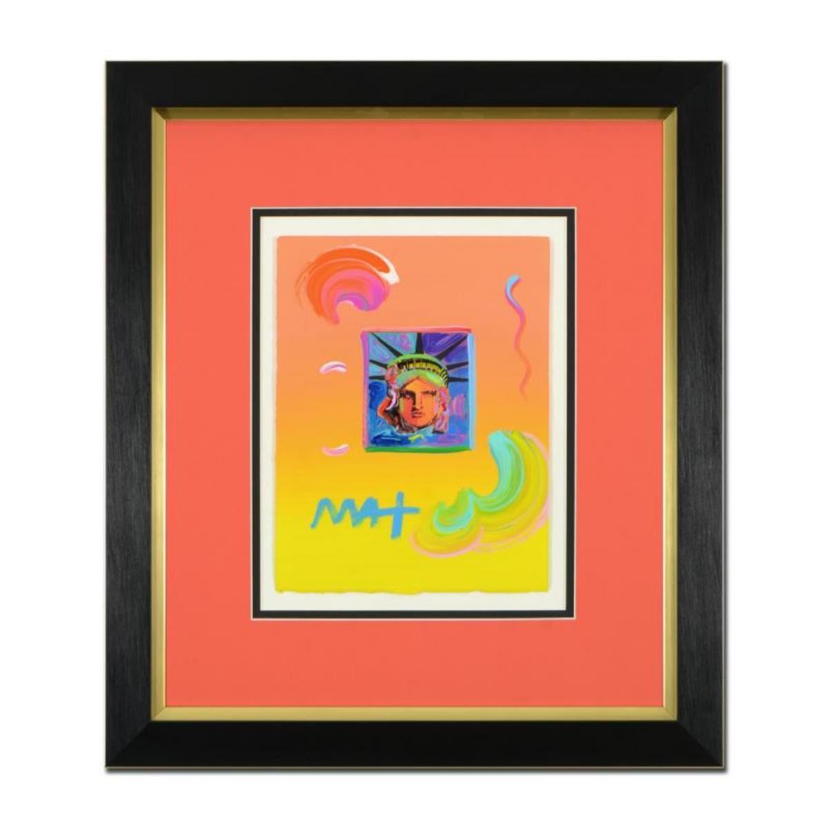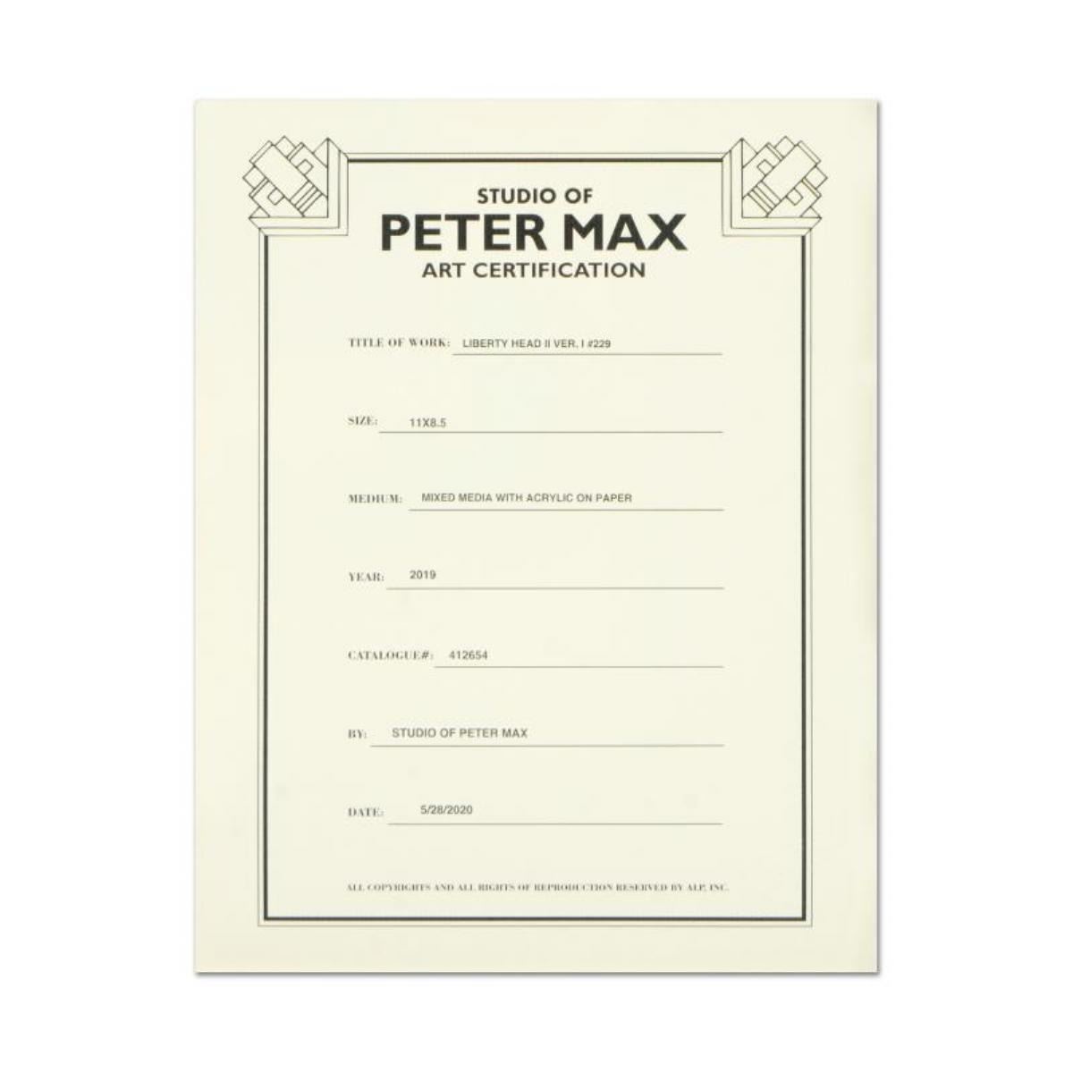 Liberty Head II is a one-of-a-kind acrylic mixed media on paper, hand signed by Peter Max. This piece comes custom framed. Includes Certificate of Authenticity from Peter Max Studios. Measures approx. 19.5" x 21.5" (with frame), 8.5" x 11" (image).
