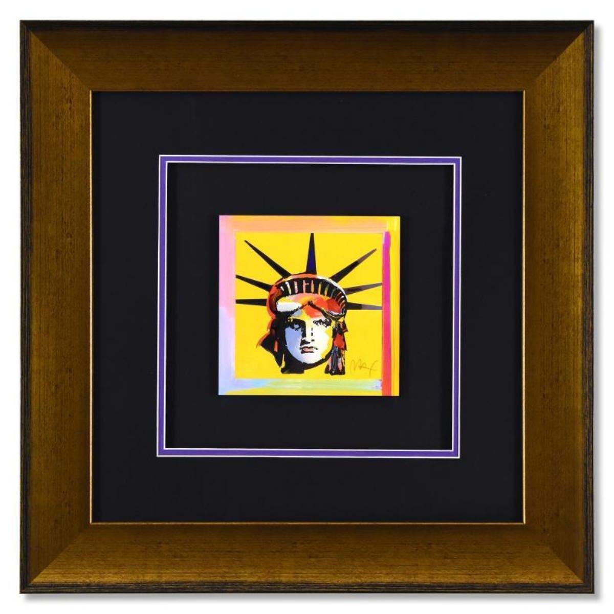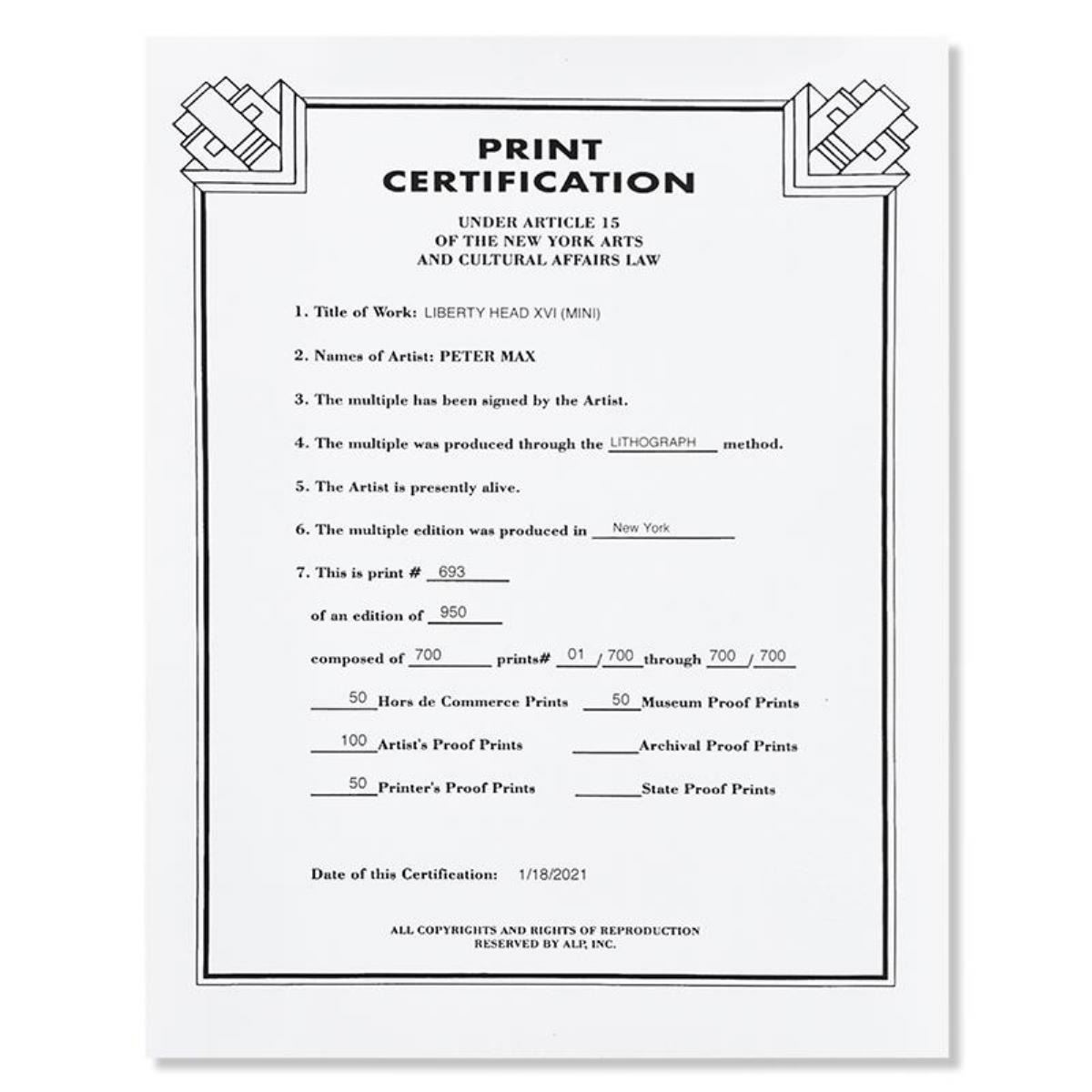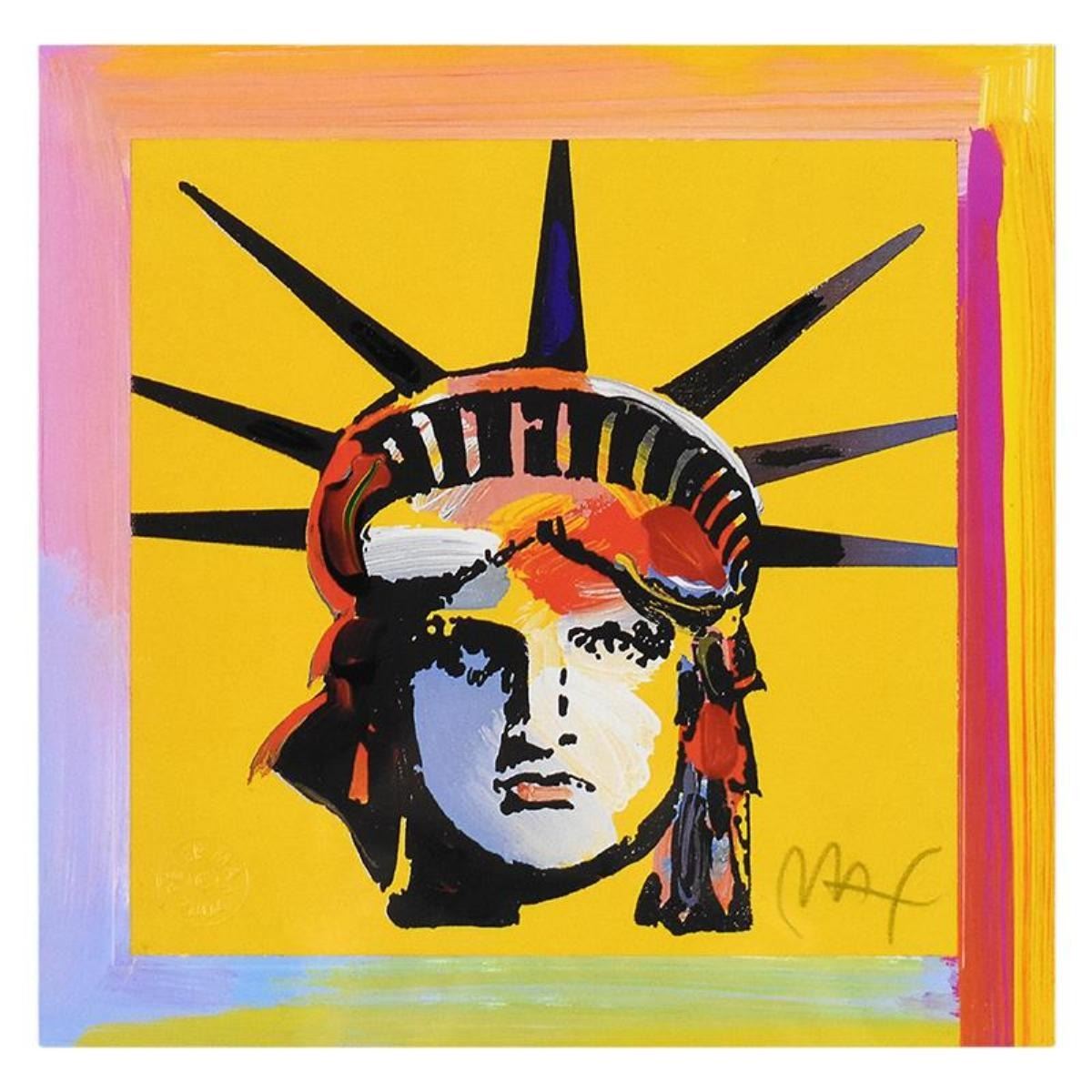 Liberty Head XVI by Peter Max. "Liberty Head XVI" is a limited edition lithograph on paper by Peter Max, numbered 693/700 and hand signed by the artist. This piece comes framed and includes Certificate of Authenticity from Peter Max Studios. Measures approximately 22" x 22 (frame), 7" x 7" (image).