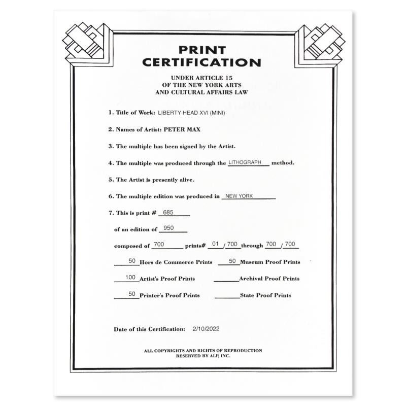 "Liberty Head" is a limited edition lithograph on paper by Peter Max, numbered 685/700 and hand signed by the artist. This piece comes framed. Includes Certificate of Authenticity from Peter Max Studios. Measures approximately 20" x 20" (frame), 7" x 7" (image). ** Please note: there is a scuff mark on the top-right frame corner. **