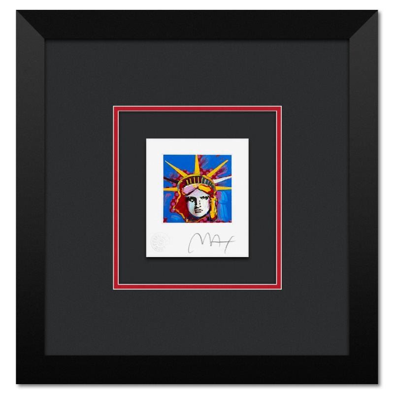 "Liberty Head" is a limited edition lithograph on paper by Peter Max, numbered and hand signed by the artist. This piece comes framed. Includes Certificate of Authenticity from Peter Max Studios. Measures approx. 13.5" x 13" (frame), 3.5" x 3" (image).