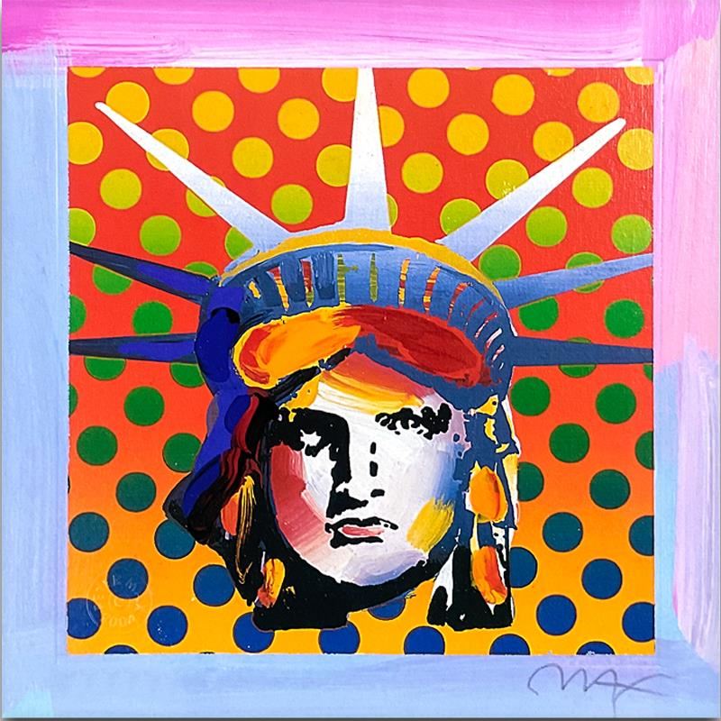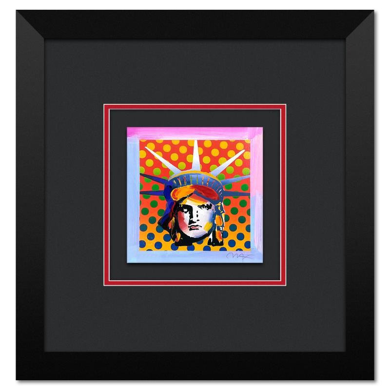 "Liberty Head" is a limited edition lithograph on paper by Peter Max, numbered and hand signed by the artist. This piece comes framed. Includes Certificate of Authenticity from Peter Max Studios. Measures approx. 17" x 17" (frame), 7" x 7" (image).