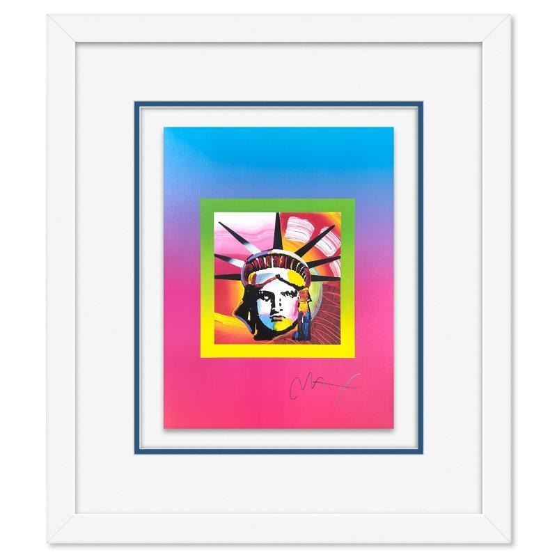 "Liberty Head on Blends Ver II" is a limited edition lithograph on paper by Peter Max numbered and hand signed by the artist. This piece comes framed. Includes Certificate of Authenticity from Peter Max Studios. Measures approx. 27" x 23" (frame) 17" x 13" (image).