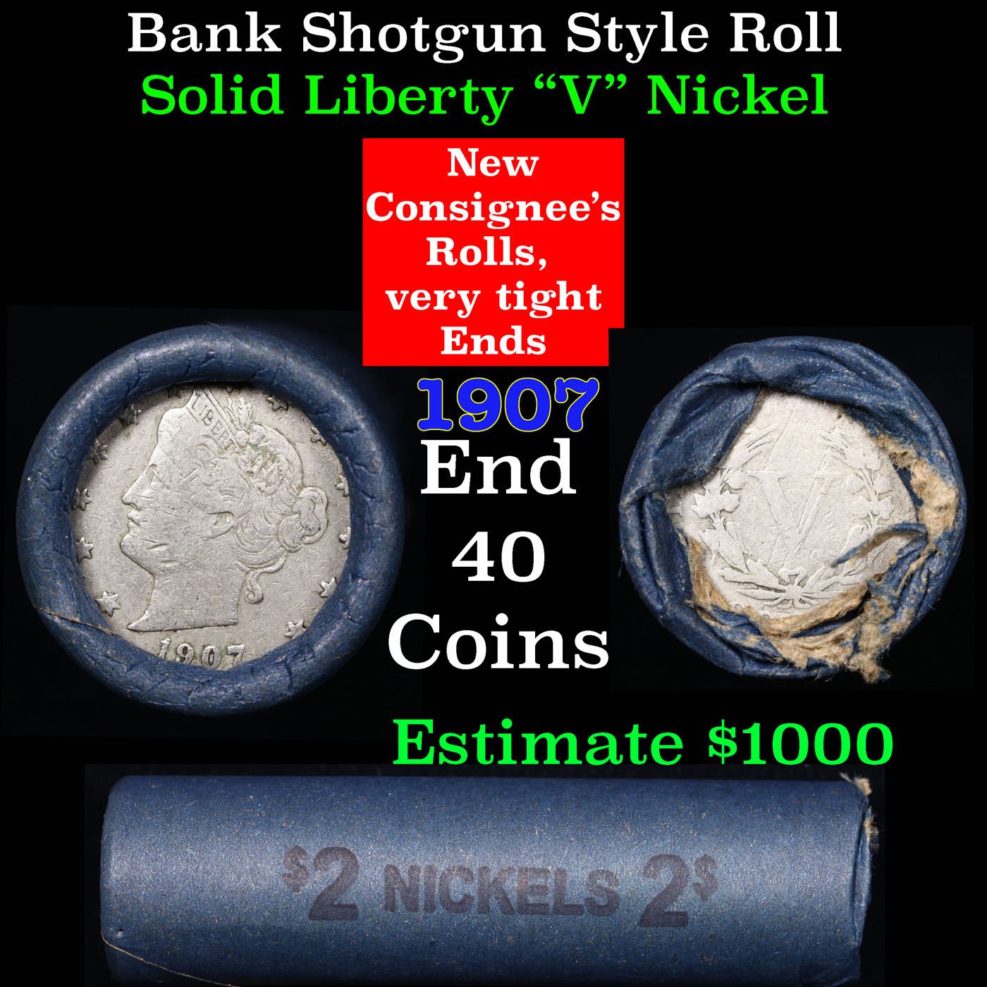 Liberty Nickel Shotgun Roll in Wrapper 1907 & P Mint Ends. The roll is held in an old $2 Nickle wrapper. They are all frrom one Estate. The ends on these rolls are very tight. We will guarantee they are all full dates.