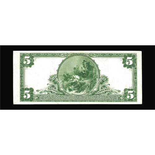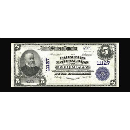 <B>Liberty, PA</B></I> - $5 1902 Plain Back Fr. 606 <B>The Farmers NB</B></I> Ch. # 11127<BR>Only $400 in Large Size Outstanding as of 1935 will forever keep this bank rare. This example is one of a mere six large in the census. The paper is bright and the purple stamped signatures of Eugene Frutiger and F.C. Roupp are faded, yet legible. <B>Extremely Fine.</B></I>
