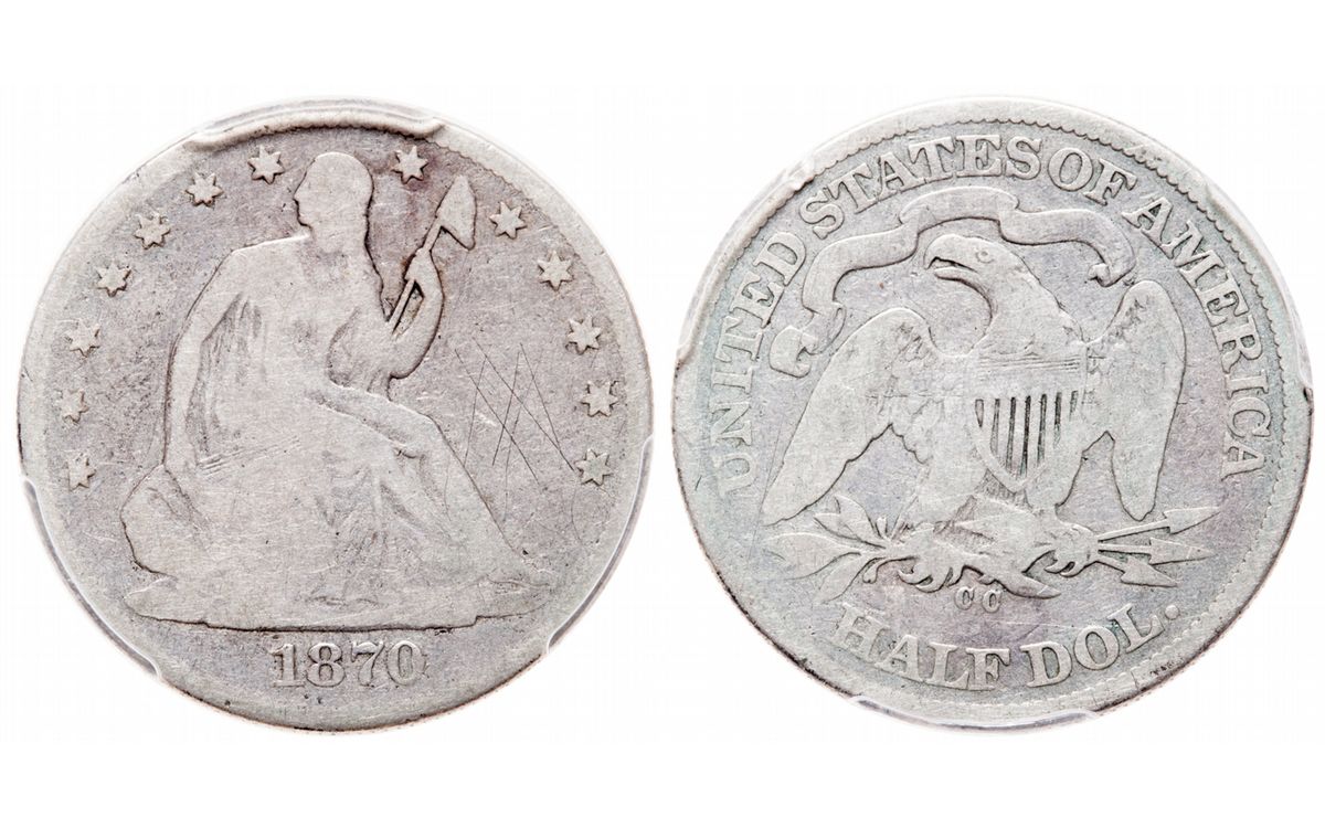 Liberty Seated Half Dollar. 1870-CC. PCGS graded Genuine. Good details. 'Graffiti' or light scratches in right obverse field.