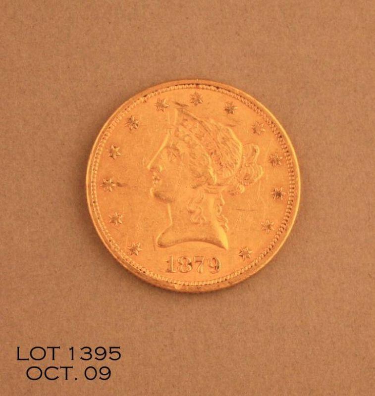 Liberty Ten Dollar gold piece dated 1879-S in circulated, ungraded good to very good condition. Est.: $350-$700.