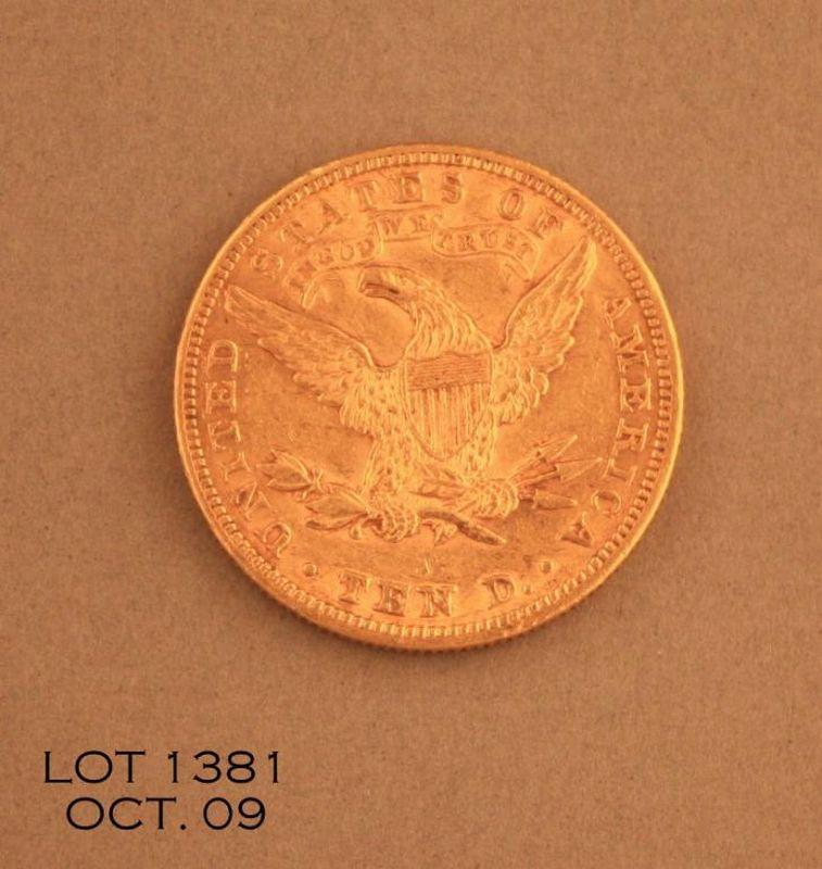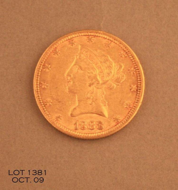Liberty Ten Dollar gold piece dated 1888 in circulated, ungraded very good condition. Est.: $350-$700.