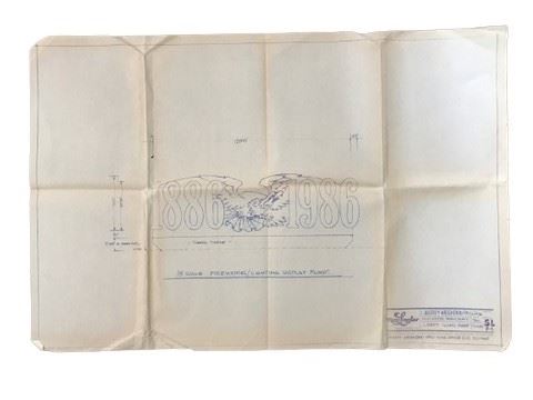 This blueprint copy is printed on 12"x36" paper and contains the blueprints in 1:8 scale for the Liberty Weekend '86 fireworks and lighting display float titled "Liberty Island Float". The float was designed to show an eagle with its wings extending out to both sides, and the years 1886 and 1986 nestled beneath its wings. René designed the 57th Academy Awards for which he won an Emmy; the Grammy Awards from 1983 to 1987; the Emmy Awards; and the County Music Awards from 1991 to 2006. He was Production Designer for the Opening and Closing Ceremonies for the 1984 Olympics in Los Angeles, and for seven events for David Wolper's Liberty Weekend in 1986, celebrating the 100th anniversary of the Statue of Liberty, for which he won an Emmy. David Lloyd Wolper was an American television and film producer, responsible for shows such as Roots, The Thorn Birds, and North and South, and the theatrically-released films Willy Wonka & the Chocolate Factory and L.A. Confidential. He was awarded the Jean Hersholt Humanitarian Award at the 57th Academy Awards in 1985 for his work producing the opening and closing ceremonies of the 1984 Summer Olympics in Los Angeles, as well as helping to bring the games there. His 1971 film about the study of insects, The Hellstrom Chronicle, won an Academy Award. Liberty Weekend was a four-day celebration held to celebrate the 1984 restoration and the centenary of the Statue of Liberty in New York City. It began on July 3, 1986 and ended on July 6.