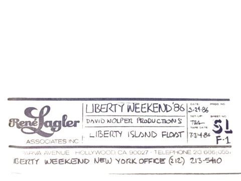 This blueprint copy is printed on 12"x36" paper and contains the blueprints in 1:8 scale for the Liberty Weekend '86 fireworks and lighting display float titled "Liberty Island Float". The float was designed to show an eagle with its wings extending out to both sides, and the years 1886 and 1986 nestled beneath its wings. René designed the 57th Academy Awards for which he won an Emmy; the Grammy Awards from 1983 to 1987; the Emmy Awards; and the County Music Awards from 1991 to 2006. He was Production Designer for the Opening and Closing Ceremonies for the 1984 Olympics in Los Angeles, and for seven events for David Wolper's Liberty Weekend in 1986, celebrating the 100th anniversary of the Statue of Liberty, for which he won an Emmy. David Lloyd Wolper was an American television and film producer, responsible for shows such as Roots, The Thorn Birds, and North and South, and the theatrically-released films Willy Wonka & the Chocolate Factory and L.A. Confidential. He was awarded the Jean Hersholt Humanitarian Award at the 57th Academy Awards in 1985 for his work producing the opening and closing ceremonies of the 1984 Summer Olympics in Los Angeles, as well as helping to bring the games there. His 1971 film about the study of insects, The Hellstrom Chronicle, won an Academy Award. Liberty Weekend was a four-day celebration held to celebrate the 1984 restoration and the centenary of the Statue of Liberty in New York City. It began on July 3, 1986 and ended on July 6.
