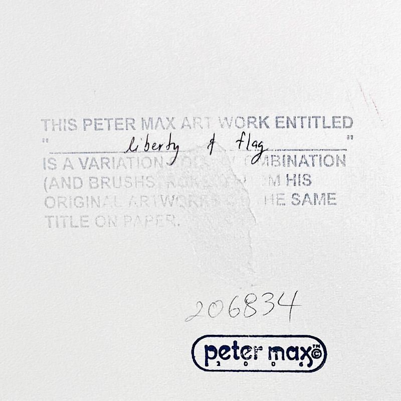 "Liberty and Flag" is a one-of-a-kind mixed media on paper, hand signed by Peter Max. The piece comes custom framed with a backside cutout to display Peter Max Studio registration number 206834 certifying authenticity. Measures approximately 28" x 24" (frame), 19" x 15" (image). This item requires special handling and may have a longer than usual turnaround.