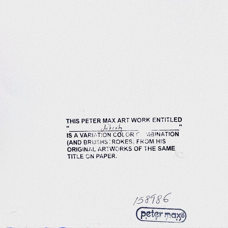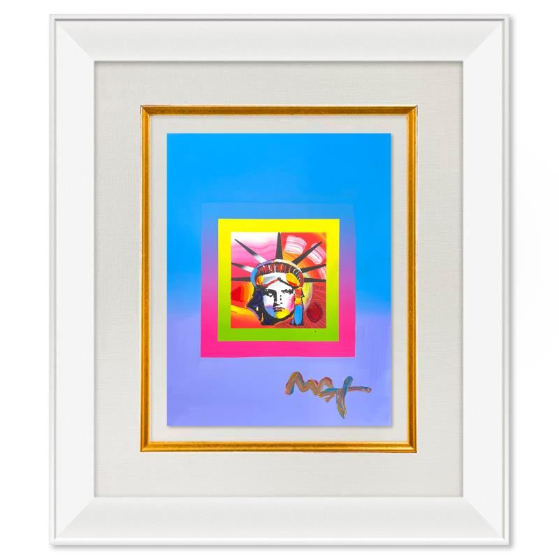 "Liberty" is a hand signed one-of-a-kind acrylic mixed media on paper by Peter Max. The piece comes custom framed with a backside cutout to display Peter Max Studio registration number 158986 certifying authenticity. Measures approximately 30" x 26" (frame), 17" x 13" (image).