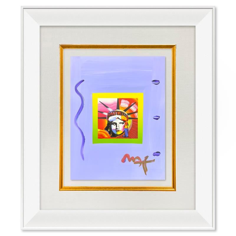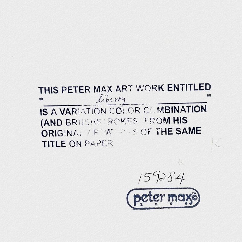 "Liberty" is a hand signed one-of-a-kind acrylic mixed media on paper by Peter Max. The piece comes custom framed with a backside cutout to display Peter Max Studio registration number 159284 certifying authenticity. Measures approximately 30" x 26" (frame), 17" x 13" (image). This item requires special handling and may have a longer than usual turnaround.