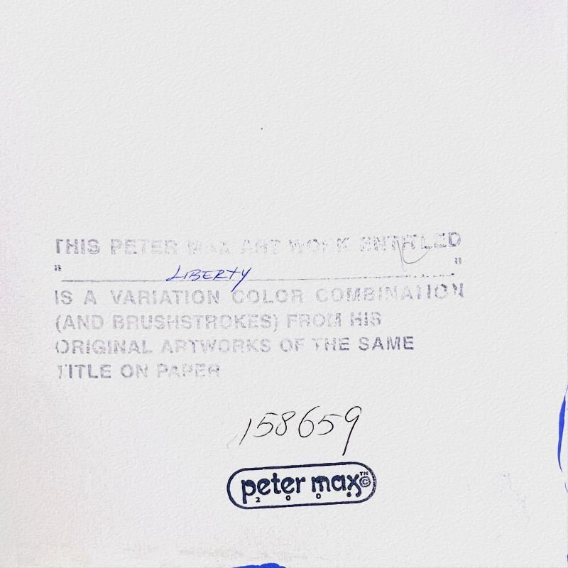"Liberty" is a hand signed one-of-a-kind acrylic mixed media on paper by Peter Max. The piece comes custom framed with a backside cutout to display Peter Max Studio registration number 158659 certifying authenticity. Measures approximately 30" x 26" (frame), 17" x 13" (image). This item requires special handling and may have a longer than usual turnaround.