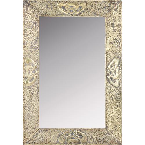 Liberty mirror, hammered brass with interlocking heart design in repousse, cleaned finish, replaced glass,14in.w x 21in.h,very good condition