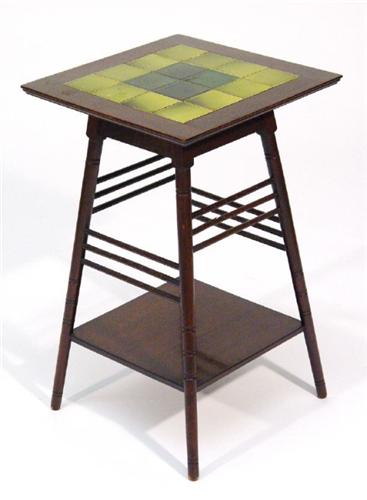 Liberty style mahogany Arts & Crafts occasional table with green glazed tiled top and under-tier, 68
