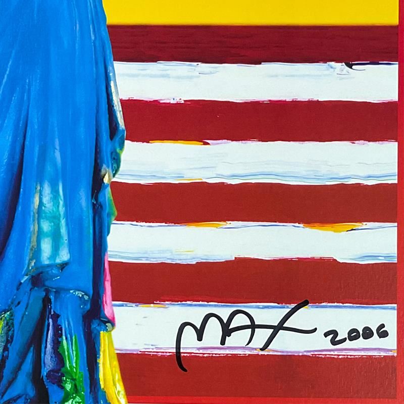 "Liberty with Earth & Flag" is an offset lithograph on paper by Peter Max, hand signed by the artist. This piece comes custom framed. Includes Letter of Authenticity. Measures approx. 23" x 29" (frame), 19" x 15" (image).