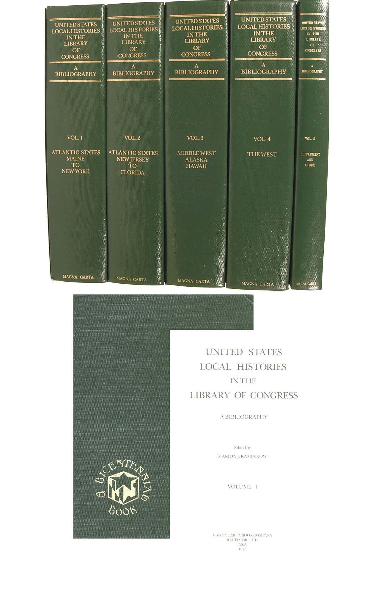 ''United States Local Histories in The Library of Congress: A Bibliography'' edited by Marion J. Kaminkow. Five volume lot. Baltimore: Magna Carta Book Co.: 1975. Quartos total more than 5,000pp. of 90,000+ entries, forming the shelf list of the Local History section of the Library of Congress. Listings provide information on early settlers, local government, churches, industry and trade, and community leaders. Green cloth boards with gilt to cover and spine. Wear to corners of two volumes, otherwise near fine. Amazing collection.