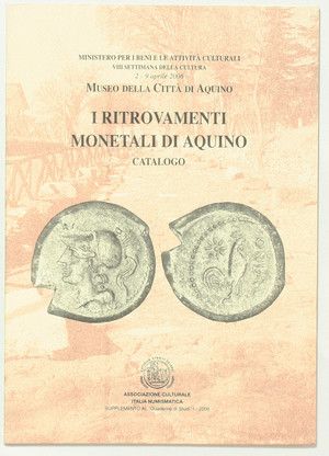 Libri di Numismatica: Mondo Greco. AA.VV. I ritrovamenti monetali di Aquino. Catalogo della mostra. Museo della città di Aquino, 2 - 9 aprile 2006. Associazione Culturale Italia Numismatica. Supplemento al Quaderno di Studi I, 2006. In-8, pp. 32, brossura editoriale.