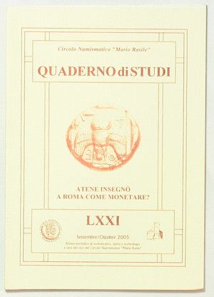 Libri di Numismatica: Mondo Greco. CORRADI, L. Atene insegnò a Roma come monetare?. Circolo Numismatico Mario Rasile. Quaderno di Studi LXXI. Formia, 2005. In-8, pp. 22, 11 tav. f.t., brossura editoriale.