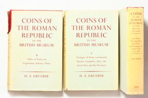 Libri di Numismatica: Mondo Romano. GRUEBER, H.A. Coins of the Roman Republic in the British Museum. 3 volumi. The Trustees of the British Museum. Oxford, 1970. In-8, pp. CXXV, 594 (vol. I); 602 (vol. II); 236, 73 tav. f.t. (vol. III), tela editoriale con sovracoperta. Ristampa anastatica dell'edizione di 1910.