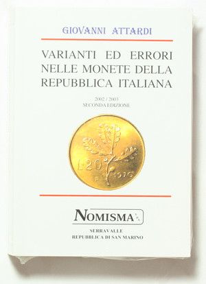 Libri di Numismatica: Monete Medievali e Moderne. ATTARDI, G. Varianti ed errori nelle monete della Repubblica Italiana. Seconda edizione. Nomisma. Serravalle (RSM), 2002. In-8, pp. 790, numerose illustrazioni n.t., brossura editoriale. Insieme a: Come nasce una moneta. In-8, pp. 21, brossura editoriale.