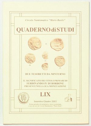 Libri di Numismatica: Numismatica Generale. NEWELL, E.T. - GIACCARDI, A. Due tesoretti da Minturno - Il significato dei titoli primari di Ferdinando IV di Borbone presenti nella sua monetazione. Circolo Numismatico Mario Rasile. Quaderno di Studi LIX. Formia, 2003. In-8, pp. 38, brossura editoriale illustrata.