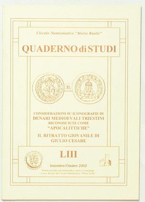 Libri di Numismatica: Numismatica Generale. RUGGIA, A. - THURI, L. Considerazioni su iconografie di denari medievali triestini riconosciute come apocalittiche - Il ritratto giovanile di Giulio Cesare. Circolo Numismatico Mario Rasile. Quaderno di Studi LIII. Formia, 2002. In-8, pp. 37, brossura editoriale illustrata.