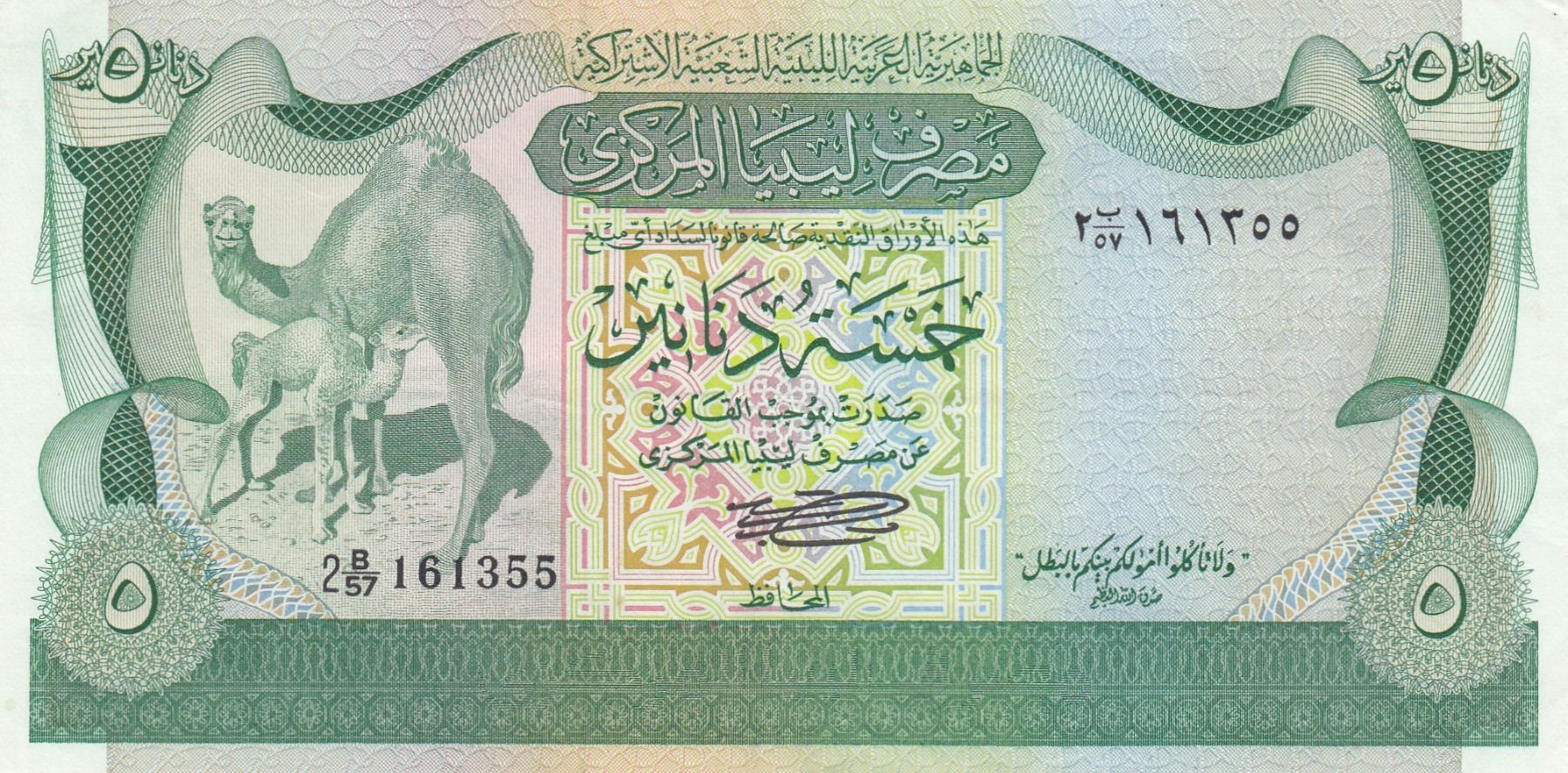 Libya, 5 Dinars, 1980, AUNC (-), p45abr/serial number: 2 B/57 161355