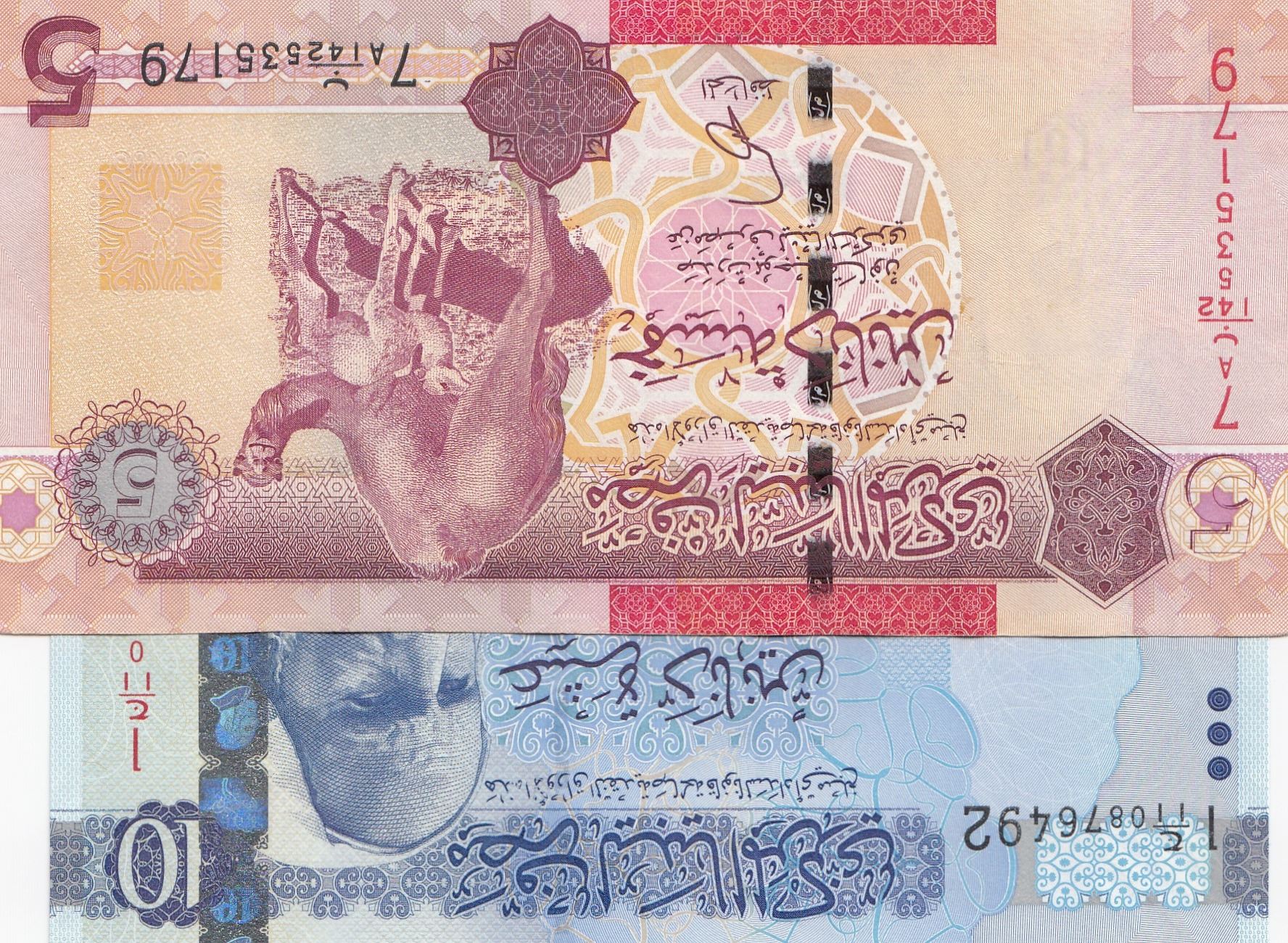 Libya, 5 Dinars and 10 Dinars, 2012/15, UNC, p77, p82br/serial numbers: 0876492 and 535179