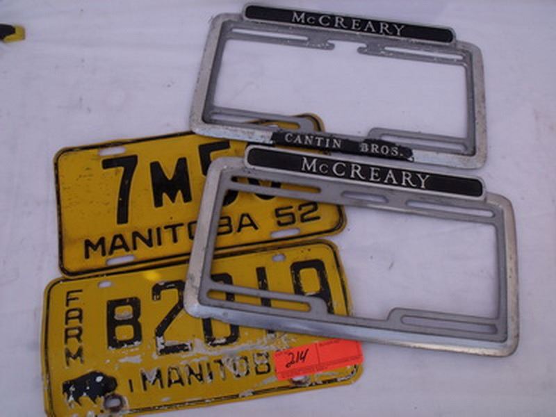 1958 Manitoba Farm License plate plus 2 White cast metal McCreary Manitoba Licence Plate frames