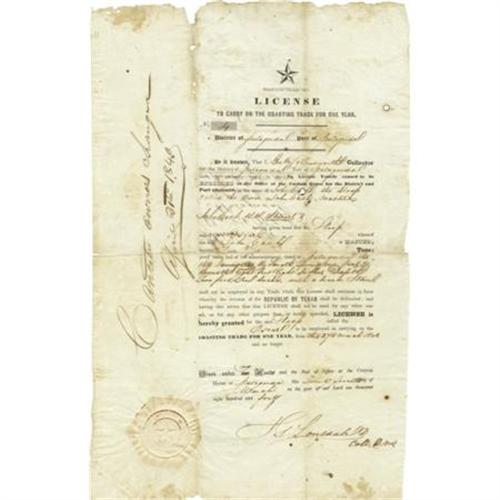 <B>License to Carry on the Coasting Trade for One Year </B></I> Partly-printed document, one page folio, 10.5" x 17", No. 4, District of Matagorda, [Houston], March 24, 1841. [Houston: Telegraph Office circa early 1840s] Signed by J.G. Lansdale as deputy port collector for the District of Matagorda. By this license Geo. M. Collinsworth, as collector of revenue, grants to John Cash, master of the sloop <I>Oscar</B></I>, a license to coastal trading for one year. Document bears a large lone star at top and a blind embossed seal in near fine condition. A few light stains and creases, with minor chipping thereat, otherwise an attractive Republic imprint.<BR><BR>George Morse Collinsworth (Collingsworth), originally from Mississippi, participated in the battle of Velasco in 1832. In early October 1835 he raised a company of infantry for service in the Texas army. This infantry, numbering about fifty, captured the Mexican garrison at Goliad on October 9, 1835. Their victory successfully cut off communication between San Antonio, then in possession of Mexican forces, and the Gulf of Mexico and secured valuable arms and supplies. <I>From the collection of Darrel Brown.</B></I><BR><BR><b>Shipping:</b> Flat Material, Small (<a target="_blank" href="http://www.heritageauctions.com/common/shipping.php">view shipping information</a>)